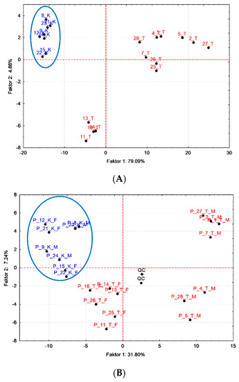 PCA Score plots for plasma (A) and urine (B) data matrix, blue ellipse, and blue point descriptions (K) represent statistically significantly different samples from the control group of pigs versus the treated (T) group of pigs; added urine labelling: M—male and F—female (Centering, STATISTICA).
