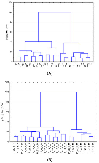 CA dendrogram of matrix data objects for plasma (A) and urine (B), labels: K—control group, T—treated group and M—male, F—female (by Euclidean distance method, STATISTICA).