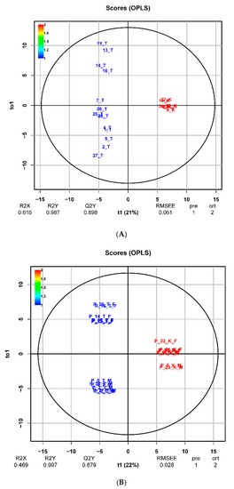 A CA dendrogram of matrix data objects for plasma and urine (Figure 5) were constructed based on the average Euclidean distance and also showed a reliable distinction between the group of tested pigs and the control group, so CA analysis confirmed the previous partial conclusion from PCA. The following graphical outputs from the third supervised OPLS-DA method (Figure 6) scatter plots also confirmed the previous conclusions and were able to significantly differentiate the group of control pigs (marked in blue) from the group of tested pigs (descriptions marked in red). The R2 (X), R2 (Y) and Q2 (Y) statistics for the OPLS-DA models were calculated. Multiple correlation R2 and cross-validated coefficient Q2 for control vs. treated group R2 (X) = 0.616, R2 (Y) = 0.987 and Q2 (Y) = 0.898 for plasma and R2 (X) = 0.469, R2 (Y) = 0.997 and Q2 (Y) = 0.879 for urine, confirmed good class separation and a high predictive ability. Coefficients Q2 (Y) expressing the predictive abilities of the proposed model were calculated for 75% cross-validation.