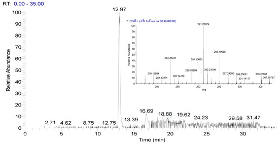 Pooled urine QC sample, control chromatogram for internal standard and corresponding mass spectrum (experimental m/z = 291.22879, ∆ppm = 0.1).