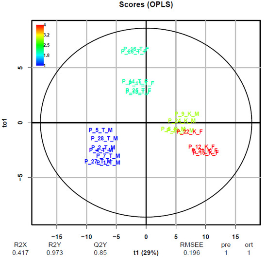 The OPLS-DA score plots for urine data matrix demonstrate discrimination between the control group of pigs and secondary discrimination by sex, objects (pigs) marked with: K—control group, T—treated group, M—male and F—female (PQN scaling, R package). A list of specific numbers of pigs is given in Table 1 and Table 2.