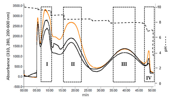 The separation was performed in a Spot-CPC-250-B Bio-Extractor 250-L centrifugal partition chromatograph (Gilson, France) with a total column capacity of 250 mL. The solvents were pumped by a SPOT-PREP II system (Armen, France), equipped with a quaternary pump, PDA detector and fraction collector. The biphasic solvent systems tested in the present work for the alkaloid separations were mixtures of methyl tert-butyl ether (MtBE)/acetonitrile (ACN)/water (W) and n-heptane (Hep)/ethyl acetate (EtOAc)/n-propanol (n-PrOH)/water (W) [15]. Solvent systems were vigorously shaken and once two phases were separated, triethylamine (TEA) was added as a retainer to the organic phase (upper) and acid (formic, acetic or HCl) was added as a displacer to the aqueous phase (lower) at different concentrations (Table S1). The organic upper phase was used as the stationary phase and the aqueous lower phase was used as the mobile phase. To carry out the refinement by pH-zone-refinement CPC, the upper organic phase was first pumped at a flow rate of 30 mL/min and the column rotated at 500 rpm without phase equilibrium. Crude Rhodolirium speciosum alkaloid extract (556.2 mg) was dissolved in 5 mL of the upper phase without retainer and 5 mL of the lower phase with displacer and loaded through a 10 mL sample loop. The lower phase was pumped into the system in descending mode at a flow rate of 12 mL/min increasing the rotation speed up to 1800 rpm. Fractions (25 mL, 26 tubes) were collected, and monitored with a scan of 200–600 nm and wavelengths 280 and 310 nm. Additionally, the changes in the pH of the effluent were monitored during each run.