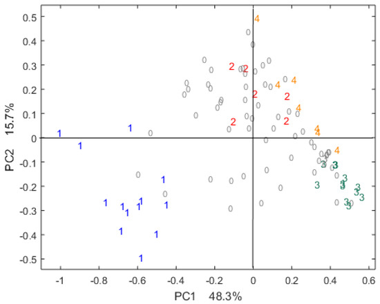 Figure 1 shows the scores of the PCA on the sensory data for the first two components, representing 48.3% and 15.7% of the total variance, respectively. These first results show the cocoa bean diversity among our samples, which is typical for the chocolate industry [44]. This diversity is essential to build robust models. Samples from the same sensory pole core are well-grouped. This is confirmed when using the third component as well (not shown).