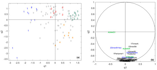 The CCSWA on the chocolate and cocoa data, a cocoa-specific space: (a) score plot. 1 = core pole 1, 2 = core pole 2, 3 = core pole 3, 4 = core pole 4 and 0 = samples not belonging to any core pole. (b) Correlation circle. Black = flavan-3-ols, blue = glycosylated flavan-3-ols, purple = ethyl-bridged flavan-3-ols, green = unknown compounds and red = hydroxycinnamic acid.
