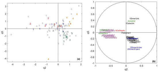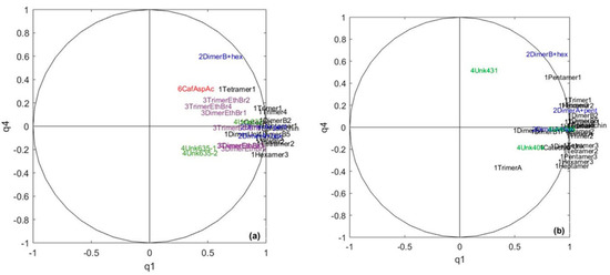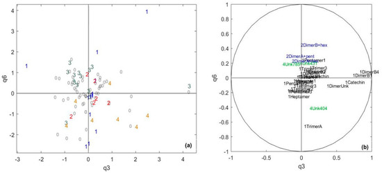 Given the variable organization and the percentage of explained variance, it seems that the first component q1 reflects the global concentration of polyphenols both in cocoa and in chocolate (Figure 5a,b). Even if the quantity of flavan-3-ols drastically drops along the chocolate-making process [48,49], there are still flavan-3-ols in chocolate [49,50,51] in quantities proportional to those present in cocoa beans. A B-type dimer linked to a hexose for both cocoa and chocolate and an unknown molecule for chocolate are the main variables building q4. As mentioned earlier, flavan-3-ol glycosides may result from a reaction of flavan-3-ols with glucose and fructose released by sucrose hydrolysis, which is also affected by fermentation (e.g., invertase enzyme activity released by some microorganisms and a temperature increase induced by fermentation). This result confirms what was obtained in the previous CCSWA on the specific dimensions of chocolate polyphenols (Figure 3).