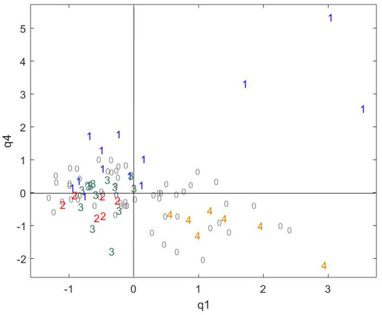 The CCSWA on the chocolate and cocoa data, a sample projection in the common space q1–q4. 1 = core pole 1, 2 = core pole 2, 3 = core pole 3, 4 = core pole 4 and 0 = samples not belonging to any core pole.