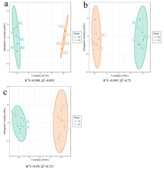 Score plots of orthogonal partial least squares discriminant analysis (OPLS-DA): (a) PB vs. PC; (b) PB vs. CC; (c) PC vs. CC. R2Y is the interpretation rate of the model to the Y matrix (Class label) and Q2 the predictive ability of the model. The model is valid when Q2 > 0.5. The X-axis is the predictive principal component, and the Y-axis is the orthogonal principal component.