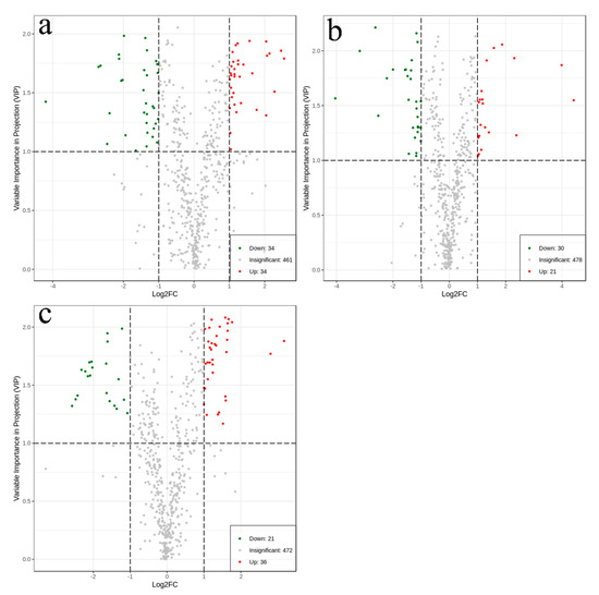 Volcano plots for (a) PB vs. PC; (b) PB vs. CC; (c) PC vs. CC. The green dots in the plots illustrated that the differential metabolites were significant and down-regulated, while the red dots illustrated that the differential metabolites were significant but up-regulated, and the black dots illustrated that the metabolites could be detected in samples but did not have any significant difference.
