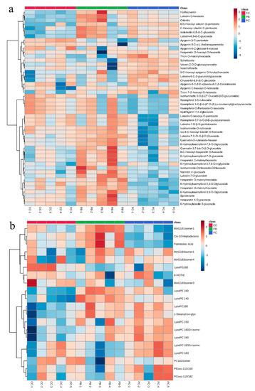 Heatmaps of hierarchical cluster analysis (HCA): (a) flavonoids; (b): lipids. The abscissa is used to display the names of samples, and the ordinate on the right is used to display the names of metabolites. The deeper the red color, the higher the content of the metabolites; the deeper the blue color, the lower the content of the metabolites.