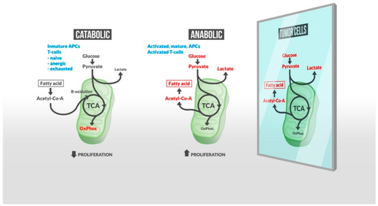 The innate immune system is the first barrier against external stimuli, which are recognized via Toll-like receptors (TLR). TLR-dependent response, which regulates the activation of antigen-presenting cells (APC) (mainly macrophages or dendritic cells (DCs)), shifts the intracellular metabolism towards the glycolysis-fueled synthesis of fatty acid (FA) [10,11]. After the initial broad immune response, an adaptive immune response is initiated when APCs process and present antigens for recognition by certain lymphocytes such as T cells. Both phases of the immune response are characterized by a fragile equilibrium, whereas the heterogeneous groups of immune cells communicate and modulate each other via cytokine release. In this sense, cytokine production in activated DCs has been related to phospholipid remodeling to support FA demands [12]. Immune effector cells, such as T cells and macrophages, are induced by tumor-specific antigens and tumor-associated antigens. However, regulatory mechanisms of the immune system, such as immune checkpoints, make this cellular response incapable of preventing tumor progression. Immune check points are inhibitory regulators crucial for maintaining self-tolerance and controlling the duration of the immune response in order to prevent collateral tissue damage [13]. Since these key immune-regulatory molecules are used by tumor cells to promote evasion, immune checkpoint inhibitors have demonstrated their effectiveness as clinical targets for cancer immunotherapy [14]. This breakthrough is based on currently approved blocking monoclonal antibodies that inhibit cytotoxic T-lymphocyte-associated protein 4 (CTLA-4) and the programmed cell death protein PD-1/PD-L1 axis [15].