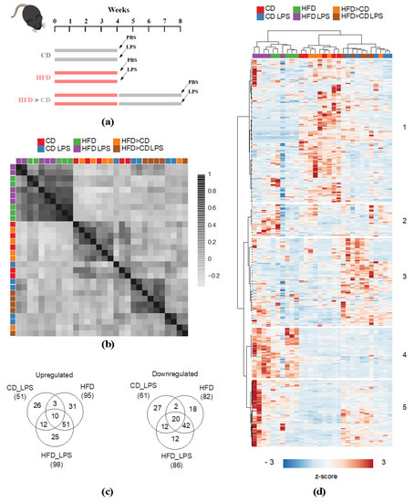 Lipopolysaccharide (LPS) exposure and high-fat-diet (HFD) feeding elicit distinct and mutual changes on systemic metabolism. (a) Schematic representation of dietary interventions. Ldlr−/− mice were either fed chow diet (CD), HFD for 4 weeks, or HFD for 4 weeks followed by CD for 4 weeks (HFD > CD). After diet intervention, mice received an intravenous LPS injection; (b) Pearson correlation analysis of all samples presented in the dataset. Correlation scores were color-scaled; (c) Metabolite and sample-wise hierarchical clustering analysis of the entire dataset; (d) Venn diagram showing overlap of up- or downregulated metabolites (q value < 0.05) between the CD_LPS-, HFD- and HFD_LPS-treated compared to the CD-fed group.