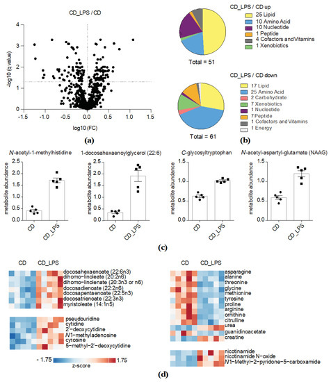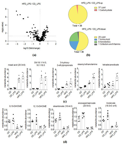Synergistic effects of LPS treatment and HFD feeding on systemic metabolism. (a) Volcano plot indicating changes in metabolite abundances between the HFD_LPS- and the CD_LPS-treated groups (q-value < 0.05 is considered significant). –log10 and log10 q-values and fold changes, respectively, are depicted; (b) Pie charts indicating numbers of altered metabolites in the HFD- compared to the CD-fed group based on their biological classification; (c) Abundances of significantly upregulated metabolites in the HFD_LPS-treated group compared to the CD-fed group. Individual values, means and SEM are presented; (d) Abundances of significantly downregulated metabolites in the HFD_LPS-treated compared to the CD-fed group. Individual values, means and SEM are presented.