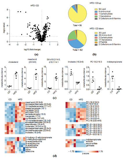 HFD feeding is strongly impacting lipid metabolites. (a) Volcano plot indicating changes in metabolite abundances between the HFD- and the CD-fed groups (q-value < 0.05 is considered significant). −log10 and log10 q-values and fold changes, respectively, are depicted; (b) Pie charts indicating numbers of altered metabolites in the HFD-fed group compared to the CD-fed group based on their biological classification; (c) Abundances of significantly upregulated metabolites in the HFD-fed group. Individual values, means and SEM are presented; (d) Representation of significantly up- or downregulated metabolites in the HFD-fed group. Metabolite abundances were z-transformed and scaled.