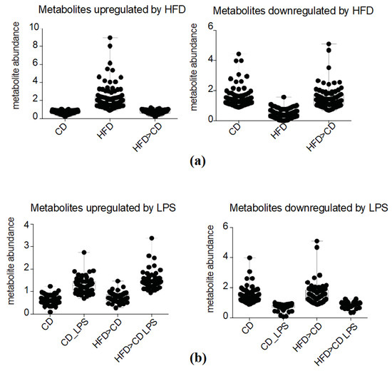 The effects of LPS exposure and HFD feeding on systemic metabolism are not of a long-lasting nature. (a) Abundances of metabolites upregulated in the CD-, the HFD- or the HFD > CD-fed groups. Means of individual metabolites are presented; (b) Abundances of metabolites upregulated by LPS challenge in the CD-fed group (CD_LPS) and the HFD > CD-fed group (HFD > CD_LPS). Means of individual metabolites are presented.