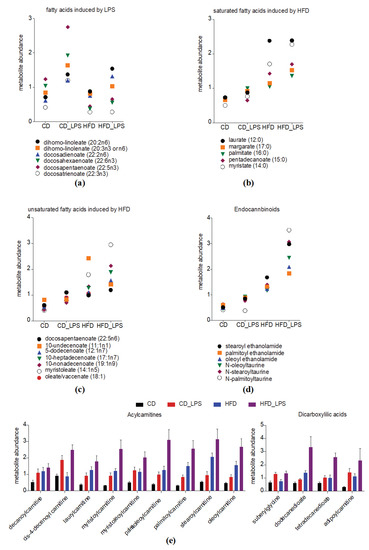 Synergistic effects of LPS treatment and HFD feeding on specific metabolite classes. (a–e) Abundances of (a) Endocannabinoids; (b) LPS-upregulated fatty acids; (c) HFD-upregulated unsaturated fatty acids; (d) HFD-upregulated saturated fatty acids in the CD-, CD_LPS-, HFD- and HFD_LPS-treated groups. Means of individual metabolites are presented; (e) Abundances of upregulated acylcarnitines and dicarboxilic acids. Means and SEM are presented.