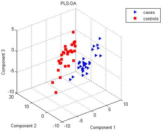 To study the metabolite identification and abundance changes between groups, we filtered out annotated peaks in the alignment table that presented in < 50% of the samples in each group. After this filtering, the GC × GC-MS dataset had 104 annotated peaks, 2DLC-MS (+) dataset had 112 annotated peaks, and 2DLC-MS (−) dataset had 106 annotated peaks. Figure 1 shows a Venn diagram among unique metabolites identified from multiple platforms after filtering. A total of 16 metabolites were commonly detected by all three platforms, while 19 metabolites by both GC × GC-MS and 2DLC-MS (+), 25 metabolites by both GC × GC-MS and 2DLC-MS (−), and 26 metabolites by both 2DLC-MS (+) and 2DLC-MS (−). Figure 2 shows the results of PLS-DA analysis using the merged data of the three platforms, which confirm that the samples are discriminated by group.