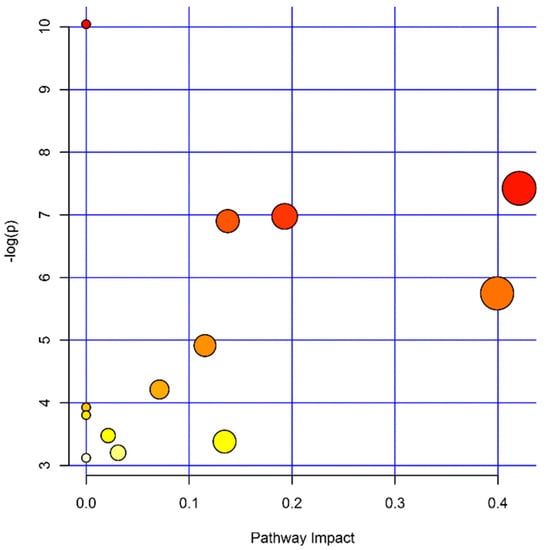 Pathways affected by the metabolic differences between cases and controls. The color and size of circles represent the sizes of the p-values (the darker the smaller) and the pathway impact scores (the larger the bigger), respectively.