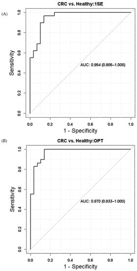 Receiver operating characteristic (ROC) results of (A) one standard error (1SE) tuned and (B) minimum (OPT) tuned.