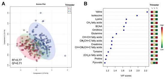 Partial least squares discriminant analysis (PLS-DA) reveals separation of maternal serum specimens from women across gestation. (A) The PLS-DA scores plot reveals separation of first- (n = 75; red), second- (n = 42; green), and third-trimester (n = 104; blue) serum specimens. (B) Variable importance of projection (VIP) plot for the first 15 metabolites that contribute to separation in PLS-DA component 1. A higher VIP score indicates a greater contribution of that metabolite to the separation of the groups.