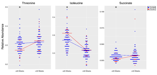 Dot plots of metabolites with interaction effects for PGDM (n = 10, <20 weeks; n = 15, >30 weeks; red) compared to non-diabetic controls (n = 78, <20 weeks; n = 77, >30 weeks; blue) during pregnancy. Significant interactions (p < 0.05) between PGDM and controls are represented by stars. Results for all metabolites that had significant interaction effects are listed in Table 3.