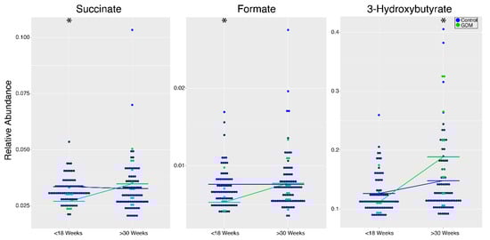 Dot plots of metabolites with interaction effects for GDM (n = 8, <18 weeks; n = 12, >30 weeks; green) compared to non-diabetic controls (n = 74, <18 weeks; n = 77, >30 weeks; blue) during pregnancy. Significant interactions (p < 0.05) between GDM and controls are represented by stars. Results for all metabolites that displayed significant interaction effects are listed in Table 4.