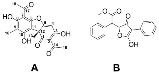 Usnea is a widespread and well-known genus of lichens found in many countries. Indeed, Usnea barbata commonly known as “old man’s beard”, “beard lichen” or “treemoss” has been used in traditional medicine for the treatment of diarrhea, ulcers, urinary infections, tuberculosis, pneumonia, stomachache, and cattle fungal disease [32]. In about 500 Usnea species including U. barbata, the polyketide usnic acid (UA), a dibenzofuran derivative existing in two enantiomeric forms, represents the most important secondary metabolite [26,33,34,35]. More specifically, (+)-UA (Figure 1) is the predominant form in Usnea species [36,37].