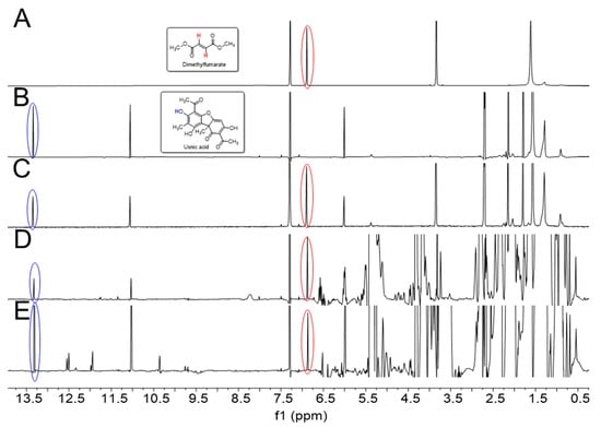 (A) 1H-NMR spectrum of dimethyl fumarate (DMFum). The singlet signal (6.89 ppm) of the alkene moiety is indicated by the red circle; (B) 1H-NMR spectrum of usnic acid (UA). The well separated singlet signal of the OH proton at C-8 (13.33 ppm) is indicated by the blue circle; (C) 1H-NMR spectrum of a 1:1 molar mixture (DMFum/UA), showing the expected integral ratio of the DMFum and UA signals of approximately 2:1; (D) 1H-NMR spectrum of U. barbata extract using sunflower oil as the extractant; (E) 1H-NMR spectrum of a commercial U. barbata CO2 extract (Flavex®). All spectra (except for (B)) are scaled to the same height of the DMFum signals.