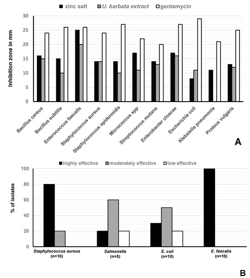 Antimicrobial activity of U. barbata preparations. (A) Size of the inhibition zone of the sunflower-oil U. barbata extract and its zinc salt on Gram-positive and Gram-negative reference strains; (B) In vitro effect of the salt on S. aureus (n = 10), Salmonella spp (n = 5), E. coli (n = 10), and E. faecalis (n = 10) strains isolated from chickens. Not effective (very small inhibition zone) ≤8 mm, low effective (small inhibition zone) = 8–13, moderately effective (medium inhibition zone) = 14–19 mm, and highly effective (large inhibition zone) ≥20 mm. Sunflower oil was used as negative control and did not cause a zone of inhibition.