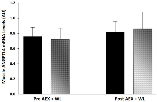 Baseline physical and metabolic characteristics, and the gene expressions of men (n = 18) and women (n = 17), are presented in Table 2. The men and women had comparable BMIs and fat masses. Men had higher body weight, FFM and VO2max than women (all p < 0.05). The men had a significantly lower percent of body fat than women. Women had higher total cholesterol, HDL-cholesterol and LDL-cholesterol than the men (p < 0.05). Fasting glucose, insulin and serum ANGPTL4 were not significantly different between groups. Skeletal muscle ANGPTL4 mRNA was lower in men than women (p ˂ 0.01) (Figure 2A). There are significant differences between men and women regardless of glucose tolerance status (NGT men (n = 10) vs. NGT women (n = 10): 0.14 ± 0.19 vs. 1.07 ± 0.22, p < 0.05) and (IGT men (n = 8) vs. IGT women (n = 7): 0.63 ± 0.13 vs. 1.33 ± 0.26, p < 0.05). PPARα mRNA was higher in men than in women (p ˂ 0.01) (Figure 2B). There was no significant change in skeletal muscle ANGPTL4 after AEX + WL in men (0.507 ± 0.119 vs. 0.493 ± 0.095 AU) or women (1.174 ± 0.167 vs. 1.307 ± 0.244 AU). In addition, there were no significant changes in serum ANGPTL4 in men (343.8 ± 48.0 vs. 372.3 ± 70.4 pg/mL) or women (374.3 ± 71.4 vs. 450.5 ± 94.4 pg/mL).