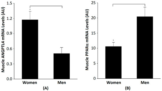 (A) Relative skeletal muscle ANGPLT4 mRNA expression at baseline (pre AEX + WL) in women (n = 17) and men (n = 18) (p ˂ 0.01, between groups) and (B) relative skeletal muscle PPARα mRNA expression at in women (n = 8) and men (n = 9), (* p < 0.05, between groups).