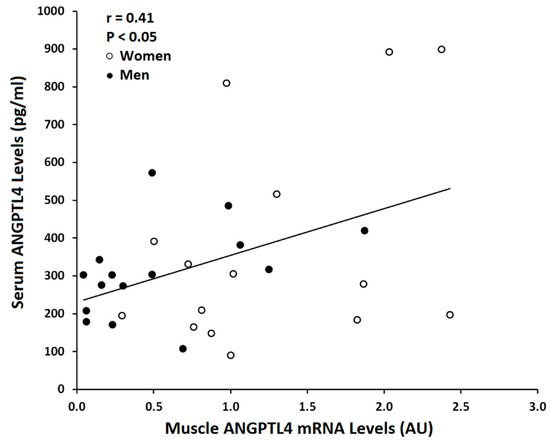 Relationship between muscle ANGPTL4 mRNA level and serum ANGPTL4 level (Total: n = 30, Women ○: n = 15, Men ●: n = 15; r = 0.41, p < 0.05) before the intervention.