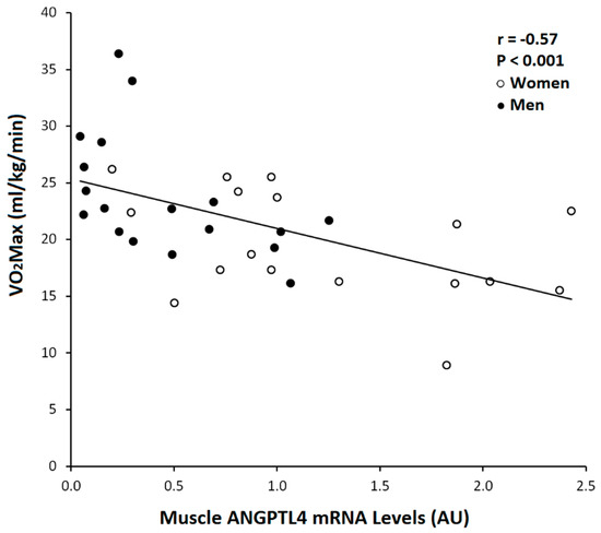 Relationship between muscle ANGPTL4 mRNA level and VO2max (Total: n = 35, Women ○: n = 17, Men ●: n = 18; r = 0.57, p < 0.001) at baseline.