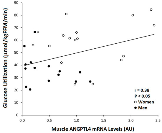 Relationship between muscle ANGPTL4 mRNA level and glucose utilization (M) (Total: n = 32, Women ○: n = 17, Men ●: n = 15; r = 0.38, p < 0.05) at baseline.