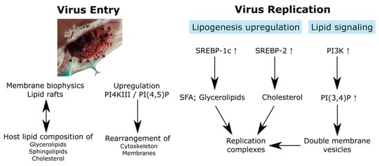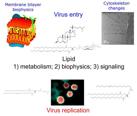 All ssRNA+ viruses initially infect mammal cells through the interaction of virus proteins with any given host cell protein. Further fusion of the virus and host cell membranes is required for the viral genetic material to get into the cell. Once inside the cell, the genomic and subgenomic viral RNAs are translated into the virus proteins; these then lead the virus replication, which is a process that involves modulation of the host cell lipid metabolism [3,5,6]. Consequently, along with other features, current lipid studies about the aforementioned virus infection focus their research on membrane fusion and modulation of the lipid metabolism of the host cell. These two processes are considered separated disciplines of the infection.