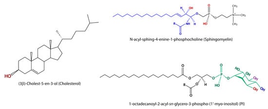 Since the dominant phospholipid in the outer leaflet of most membranes is the bilayer-forming, positive charged diacylglycerophosphosphocholine (PC), the idea was raised that the viral docking to the receptor on the target cell and, consequently, the membrane fusion were likely to take place at specific microdomains with particular lipid composition, the so-called lipid rafts [27,32,33,34,35,36]. A special characteristic of the lipid rafts is the high content of cholesterol [37,38,39]. Even though a high content of sphingolipids and gangliosides is also a defining characteristic of lipid rafts (Figure 1), direct in vivo visualization still remains unresolved [39].