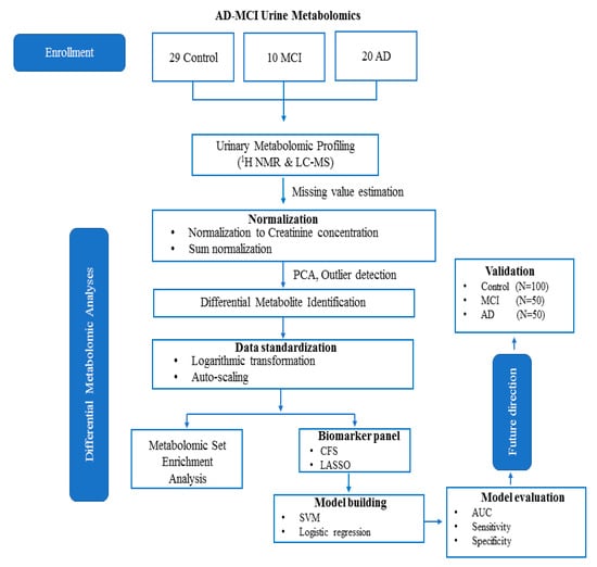 Through using proton nuclear magnetic resolution (1HNMR) spectroscopy and high-performance liquid chromatography–tandem mass spectrometry (LC-MS), a great deal of progress has been made toward metabolically profiling urine. While urine may be considered a waste product, it is considered as a valuable diagnostic biofluid []. It is readily available, non-invasive to collect, and provides a direct readout of what is happening within the body, making it an ideal matrix to identify a potential biomarker panel for AD [,,,]. One of the many problems associated with metabolomics is that no single platform can measure the entire metabolome. Therefore, combining 1H NMR and LC-MS enhances our coverage of the urine metabolome, increasing the likelihood that we will identify clinically viable potential biomarkers of MCI and AD.