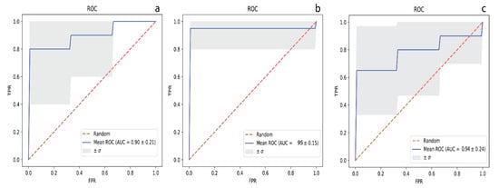 The respective receiver operating characteristic (ROC) curves with representative area under curve (AUC) values for distinguishing (a) HC from MCI, (b) MCI from AD, and (c) HC from AD, respectively.