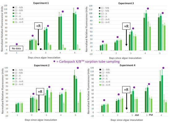 Daily chlorophyll fluorescence time points tracked algal concentrations for each of the four experiments. Carboys 1 and 2 (C1, C2) were media blanks (MB) and Carboys 3, 4, 5, and 6 (C3, C4, C5, C6) were inoculated with algae (A) at the beginning of the time course (day 0, fluorescence data not shown) and only C5 and C6 had rotifers added (+R) after 48 h of algal cultivation (A + R). Carbopack B/X™ sorption tube sampling occurred at each of the time points denoted with a purple dot (•) on each graph. Data for Experiments 1–3 derived from [17]. Error bars represent standard deviation taken from duplicate chlorophyll fluorescence measurements for each culture.