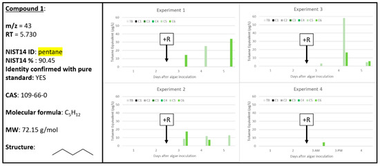 Compound 1, identified as pentane by the NIST14 database at 90.45% and confirmed using pure standard, is one of the lowest molecular weight (MW) chemical signals captured by the Carbopack B/X™ sorption tubes (72.15 g mol−1 MW). Compound 1 was determined to be correlated to A + R samples, only, in all four of the experiments (Figure 2) and was highest after 48 h of rotifer grazing in Experiment 3 at almost 60 pg L−1. For all other samples for which Compound 1 was detected, it was typically at approximately 20 to 30 pg L−1. Pentane is an observed product of lipid catabolism by hydroperoxide lyase, known to act on linoleic acid in some algae, such as the green alga Chlorella pyrenoidosa [22] and the blue-green alga Oscillatoria sp. [23]. The authors of these works concluded that there are no known roles for these metabolites in either algal species, but it is possible that fatty acid breakdown could have an unknown allelopathic effect for grazer deterrence. Here, our data support that pentane is a reliable biomarker for algal grazing as indicated by the robust observation and correlation to A + R samples in Experiments 1–3 (Figure 2).