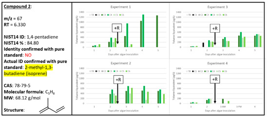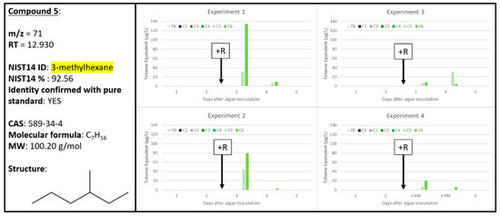 Compound 2, tentatively identified as 1,4-pentadiene by the NIST14 database at 84.8% (Figure 3), was the smallest chemical (MW = 68.12 g mol−1) to be correlated to the biological samples in all four experiments. Interestingly, there is not a clear pattern for Compound 2 in terms of correlation to A or A + R samples. In Experiment 1, where only 30 min of sampling was employed for sample collection, Compound 2 was correlated with healthy algal cultures with increasing abundance over time as algal concentration increased in C3 and C4. The Compound 2 signal diminished quickly within 24 h after rotifer addition (C5, C6). Similarly, in Experiments 2 and 4, the Compound 2 signal diminished over time with decreased algal concentrations in C5 and C6 with active rotifer grazing. Experiment 3, however, showed very different results for Compound 2 abundance over the time course of the experiment: signal increased daily and at similar levels across all biological samples (C3–C6). This could be explained by Experiment 3 displaying the lowest impact of grazing rotifers of the four experiments. Experiment 3 exhibited approximately a 30% decrease in algal concentration between A and A + R cultures by day 5, compared to 50–90% decreases in Experiments 1, 2, and 4 (Figure 1). If Compound 2 is indeed a signal generated by healthy algae, then perhaps this high relative concentration of healthy algae still present within the A + R cultures in Experiment 3 resulted in the higher relative signal. Also interesting, Experiment 4 indicated the lowest levels of Compound 2 (in all samples), despite employing the longest sampling time of 120 min. The low levels could be related to sample breakthrough for Compound 2 on the Carbopack B/X™ matrix. Regardless, with 200 to almost 1400 pg L−1 of Compound 2 collected in Experiments 1–3, it was the highest quantity of VOC collected over the four experiments.