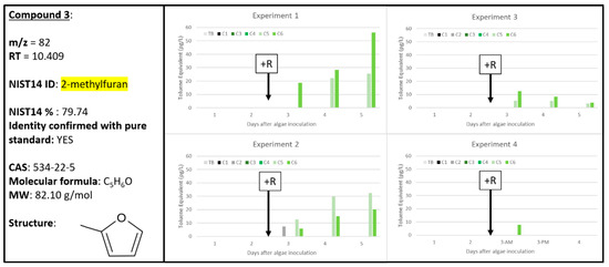 Compound 3 confirmed to be 2-methylfuran (534-22-5). Graphs indicate quantity of Compound 3 reported in each of the four experiments in pg L−1, where Carboys 1 and 2 (C1, C2) were media blanks (MB) and Carboys 3, 4, 5, and 6 (C3, C4, C5, C6) were inoculated with algae (A) at the beginning of the time course (day 0, data not shown) and only C5 and C6 had rotifers added (+R) after 48 h of algal cultivation (A + R).