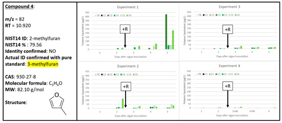 Compound 4 confirmed to be 3-methylfuran (930-27-8). Graphs indicate quantity of Compound 4 reported in each of the four experiments in pg L−1, where Carboys 1 and 2 (C1, C2) were media blanks (MB) and Carboys 3, 4, 5, and 6 (C3, C4, C5, C6) were inoculated with algae (A) at the beginning of the time course (day 0, data not shown) and only C5 and C6 had rotifers added (+R) after 48 h of algal cultivation (A + R).