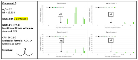 The chemical signal most strongly correlated with A + R samples was Compound 6, which was tentatively identified by NIST14 as 3-pentanone = and subsequently confirmed by analysis of pure compound (Figure 7). Compound 6 was the second chemical signal, besides Compound 5, to be found robustly (in at least 3 samples) in all four experiments and exclusively in the A + R samples. Additionally, the amount of Compound 6 generated within each experiment scaled with the extent of apparent algal biomass loss to rotifer grazing in each experiment, shown in Figure 1. For example, in Experiment 1, the algal concentration after grazing was the lowest and was correlated with an increase in the concentration of Compound 6 (approximately 160 pg L−1) on Day 4. Similarly, the lowest levels of Compound 6 were detected in Experiment 3, which also exhibited the lowest levels of algal biomass loss to grazing. Experiment 3 displayed an increase in Compound 6 over time, and increased duration of the rotifer grazing and algal biomass loss, while Experiment 4 exhibited a relatively flat level of Compound 6, which was also consistent with the comparably flat rotifer grazing rate observed for that experiment. Regardless of the differences in the rate of algal biomass loss due to rotifers observed between the four experiments (Figure 1), Compound 6 was a reliable signal specifically correlated to samples that were experiencing rotifer grazing. This suggests that Compound 6 could make a useful biomarker indication for algal cultures experiencing grazing.