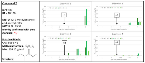 The tentative identification of Compound 7 is the methyl ester of the organic acid 2-methylbutanoic acid (Figure 8), which is structurally related to the methyl butyrate (chemically different by only one methyl group), a known fruit aroma chemical [35]. Plants are known to emit a variety of esters that have found their way into various perfumes and fragrances due to their fruity, sweet aroma. Organic acids can be converted to its related ester through the addition of an alcohol [38]. Many plant-based esters are found in essential oils and are generally associated with various therapeutic properties, including antifungal, anti-inflammatory, and antispasmodic. For Senga Sengana strawberries, the organic acid, 2-methyl butanoic acid, was found to be part of the aromatic profile [39]. For these reasons, it is plausible that the identity of Compound 7 is the methyl ester of 2-methylbutanoic acid. This publication would be the first tentative identification of the methyl ester of 2-methylbutanoic acid in algal cultures.