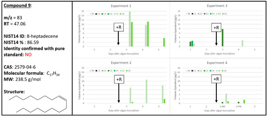 With a relatively high confidence of 86.59%, the NIST14 database tentatively identified Compound 9 as 8-heptadecene, which does have precedence in the literature as a known biogenic VOC (Figure 10). Not only has 8-heptadecene been found as an algal volatile from two brown algae, Padina pavonia (L.) Gaill and Hydroclathrus clathrus (C. Agardh) Howe, the volatile mixtures from these algae were also found to have antimicrobial activity (to varying degrees) against a panel of microbes [40]. Additionally, 8-heptadecene was found to be the major volatile produced by the marine green alga, Bryopsis maxima, after mechanical wounding [41] and during various growth phases by Nannochloropsis and other algae [15]. Unfortunately, our data for Compound 9 do not show a similarly strong correlation with rotifer grazing. Experiments 1 and 2 exclusively observe Compound 9, tentatively 8-heptadecene, with A + R samples. However, Experiments 3 and 4 indicated both A and A + R samples generated 8-heptadecene, in variable quantities with no distinct pattern. Additional evidence is required to characterize Compound 9 as a biomarker for wounding of Microchloropsis salina algal cultures.