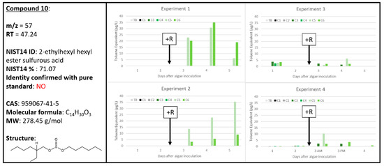 Compound 10 was tentatively identified as 2-ethylhexyl hexyl ester sulfurous acid albeit with a relatively low NIST14 confidence score of 71.07% (Figure 11). Interestingly, as seen with Compound 9, Compound 10 was highly correlated to A + R samples in Experiments 1 and 2, but this relationship was not replicated in Experiments 3 and 4. Potentially, there were unknown biological conditions in Experiment 1 and 2 that resulted in Compounds 9 and 10 being highly correlated to A + R samples, but not in Experiments 3 and 4. The only tenuous link to plant-based volatile literature for Compound 10′s tentative identification as 2-ethylhexyl hexyl ester sulfurous acid is its detection in the vinegar-processed medicinal herb, Curcuma zedoaria [42]. Like Compounds 8 and 9, additional wounding experiments of Microchloropsis salina need to confirm whether Compound 10 is useful as a biomarker of algal health.