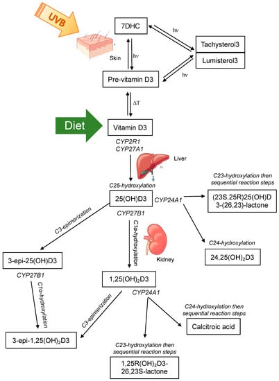 The major classical vitamin D pathway, whereby vitamin D3 is either produced in the skin via photochemical (hν) conversion of 7-dehydrocholesterol (7DHC) to pre-vitamin D3 and subsequent thermoisomerization (ΔT) to vitamin D3, or consumed in the diet. Vitamin D3 is hydroxylated at C25 in the liver by CYP enzymes and then subsequently subject to further hydroxylation or C3-epimerization in the kidney. Note that vitamin D2 is activated by CYP2R1 and CYP27B1 and can undergo C24 hydroxylation and C3-epimerization as shown for vitamin D3, but is only consumed through the diet and not endogenously produced.