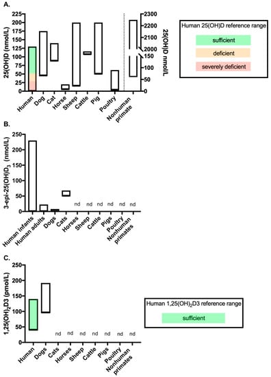 Vitamin D metabolite concentrations across species measured by LC-MS/MS (data from the studies included in Table 1). Figure showing the range of (A) 25(OH)D, (B) 3-epi-25(OH)D3 and (C) 1,25(OH)2D3 concentrations measured in healthy adult controls of each species by LC-MS/MS. Where available, reference ranges are highlighted by coloured bars. The human 25(OH)D and 1,25(OH)2D3 reference ranges are from the NHS website (accessed September 2020). No reference range exists for 3-epi-25(OH)D3 in humans, therefore data from a systemic review which reported ranges from several studies was used (see Bailey et al. (2013) [79]). The number of studies included to provide data for each of the veterinary species are as follows: (A) dogs n = 8 [80,81,82,83,84,85,86,87], cats n = 1 [85], horses n = 1 [88], sheep n = 4 [30,89,90,91], cattle n = 2 [92,93], pigs n = 1 [94], poultry n = 2 [95,96] and nonhuman primates n = 2 [97,98]; (B) dogs n = 2 [81,85] and cats n = 1 [85]; and C. dogs n = 1 [83]. nd = no data available for the metabolites measured by LC-MS/MS in that species. In chart (A), data for nonhuman primates’ measures against the right-hand Y-axis.