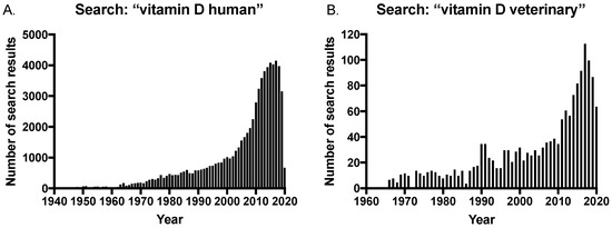 The long-established importance of maintaining vitamin D sufficiency has been further corroborated given the discovery of extra-skeletal effects of vitamin D, and this has led to an increase in studies investigating vitamin D levels and disease in both humans and veterinary species. This is reflected in the growing number of publications on the subject, with a rapid increase in the number of search results on PubMed® for vitamin D and humans in the last 20 years (Figure 3A). In contrast, there was a delay in the veterinary field with an increase in publications only occurring within the last 10 years (Figure 3B); and significantly, the number of search results for “vitamin D veterinary” is approximately only 2.5% of that of the human search results at the peak of publications in 2017 (searched on pubmed.ncbi.nih.gov in July 2020).