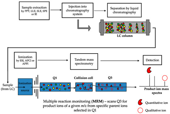 Workflow of LC-MS/MS method for vitamin D metabolite quantification. Samples (usually serum) are prepared by an extraction method (such as protein precipitation (PPT), liquid-liquid extraction (LLE), supported liquid extraction (SLE), solid phase extraction (SPE) or immunoextraction (IE)) and then injected into the liquid chromatography system. Metabolites are chromatographically separated based on physical and chemical interactions (represented by the different shapes) with the LC column and are introduced to the ionization source of the mass spectrometer. Metabolites are ionized by either electrospray ionization (ESI), atmospheric pressure chemical ionization (APCI), or atmospheric pressure photoionization (APPI). During tandem mass spectrometry, when multiple reaction monitoring (MRM, which is the same as selected reaction monitoring but more than one reaction is monitored) is used, a predefined parent ion is identified based on its m/z transition (the full red circles, with other colours representing different parent ions) in the first quadrupole (Q1) and is selected to enter the collision cell. In the collision cell, the parent ion is fragmented into defined product ions, which are then passed through into the third quadrupole (Q3). In Q3, defined quantitative and qualitative product ions (the red pie and open circle, respectively) are detected and used for identification and quantification. The peak response of the quantitative and qualitative product ions is converted into a ratio which should be consistent across samples and standards. Deviation from this ratio of more than 15% to 20% can indicate potential interference.